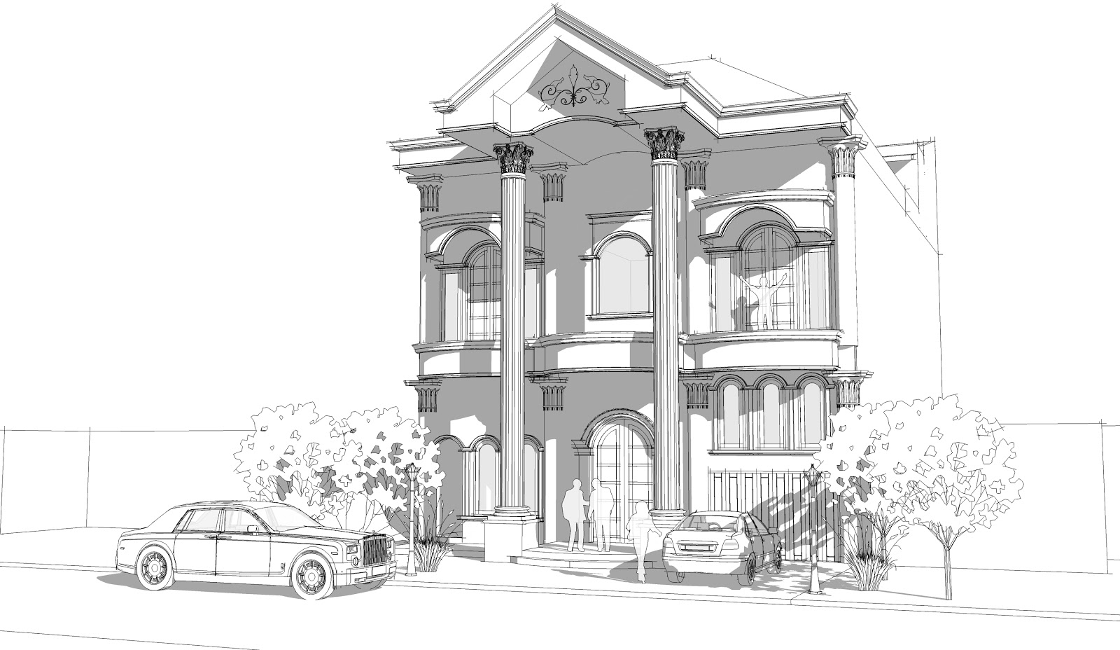 Desain Rumah Klasik - Berlokasi di Jalan Karya Tani, Medan. Desain rumah yang di minta oleh bapak Arsyad adalah rumah dengan gaya klasik. Pemilik rumah ingin rumah ini dirancang oleh arsitek medan agar terlihat megah oleh karena pilihan gaya arsitektur ini yang paling cocok dengan keinginan si pemilik. Dengan 2 (dua) kolom besar yang berada didepan rumah, rumah ini terlihat megah dan menarik perhatian orang untuk melihat rumah ini. Terlihat beberapa ukiran profil bergaya klasik yang mendukung tampilan dari rumah bergaya klasik ini.